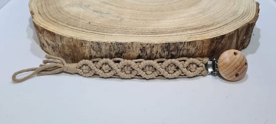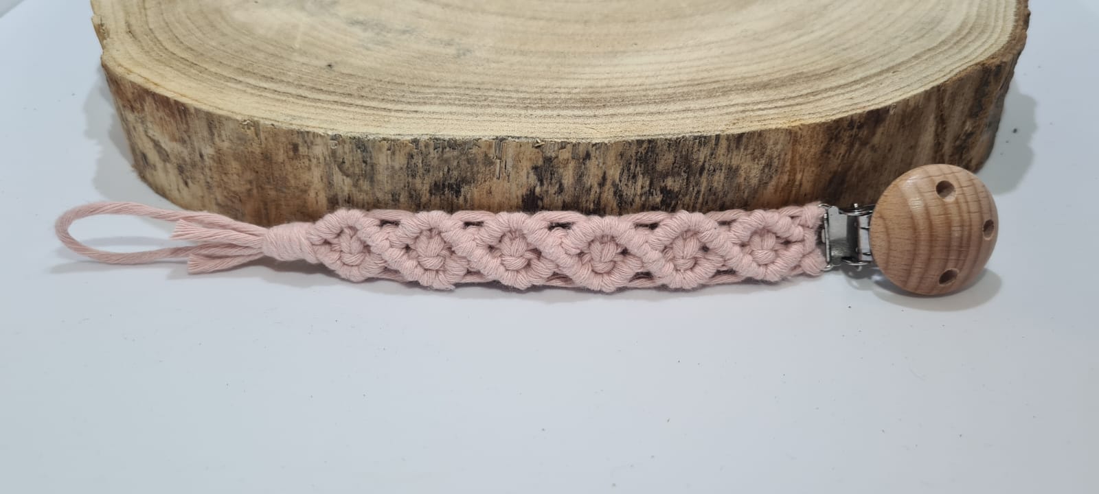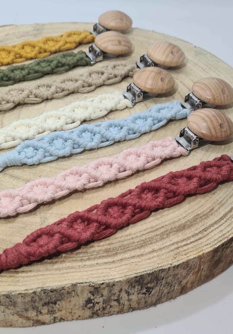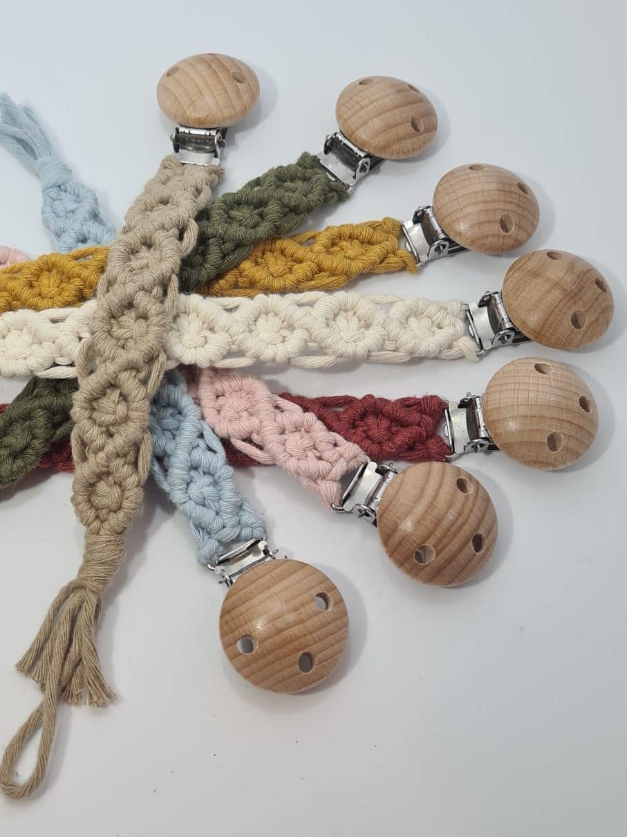 Hoe gaaf is een handgemaakt macramé speenkoord?! De houten clip sluiting zorgt ervoor dat je niet meer hoeft te zoeken naar de speen van je kindje. Het speentje is nu altijd dichtbij je baby, wel zo handig. Macramé is een handwerktechniek die bestaat uit het knopen van draden. De manier van knopen zorgt voor verschillende patronen. Dit zorgt voor een mooie bohemian uitstraling. Het speenkoord heeft een lus om de speen aan te bevestigen en een houten klip om het speenkoord te bevestigen aan bijvoorbeeld de kleding van je kindje, deken of een doekje/knuffeltje. Ook leuk om als (kraam)cadeau te geven!